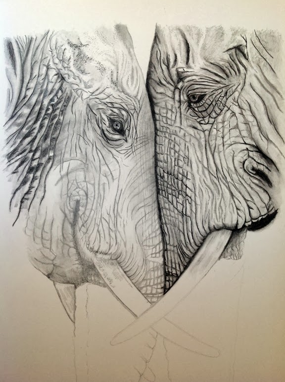 I've been fooling around in graphite and charcoal for a month or so and started this portrait of two elephants. It's going slow, slower than I thought. Their skin is so complex! I started with pencil and now I'm adding charcoal to get the tone right. Lots of blending with a stump as I go along, and removing highlights with a kneaded eraser. I'll keep posting as I go along.
